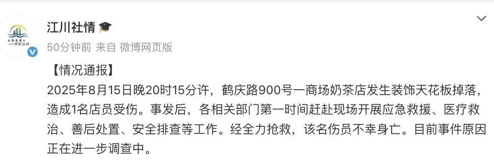 据上海市闵行区江川路街谈服务处8月16日下昼通报,8月15日20时15分许,鹤庆路900号一市集奶茶店发生装璜天花板掉落,形成1名伴计受伤。事发后,各关系部家世一技能前去现场开展救急拯救、医疗救治、善后处分、安全排查等责任。经全力抢救,该名伤员糟糕身一火。事件原因正在进一步探听中。
